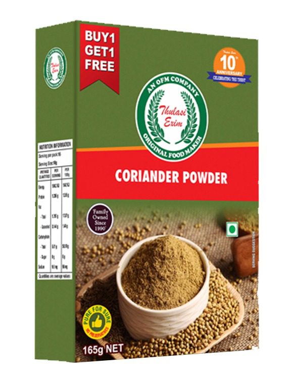 Buy Thulasi Coriander Powder 165g – made from sun-dried coriander seeds, finely ground for rich aroma and flavor. Ideal for curries, dals, spice blends, and marinades. 100% natural, preservative-free, and hygienically packed for freshness.