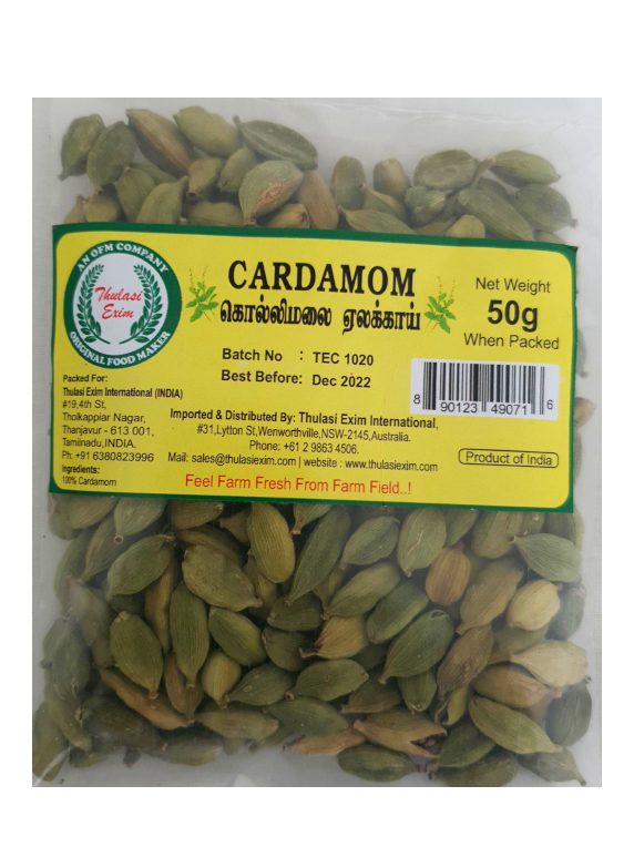 Thulasi Nilgiris Green Cardamom – 50gm offers handpicked, sun-dried elaichi pods from the Nilgiris hills. Rich in essential oils and antioxidants, it enhances flavor in tea, biryani, and desserts while supporting digestion and immunity.