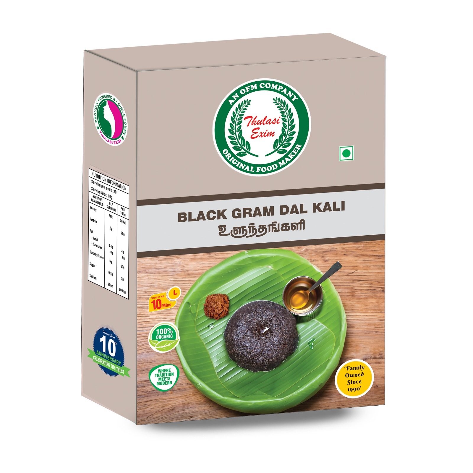 Thulasi Uluntham Kali comes ready to cook. Just add water and stir over low heat until it thickens. Serve warm with a drizzle of gingelly oil or ghee.